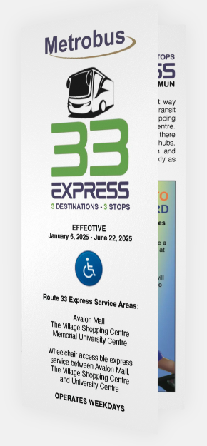 Route 33 Express is a fast, convenient way to travel between three of our major transit hubs - The Village Shopping Centre, Avalon Mall and Memorial University Centre. Service operates express, meaning there are no stops serviced between the hubs, limiting the travel time between hubs and getting you to your destination as quickly as possible. Route 33 Express is wheelchair accessible.